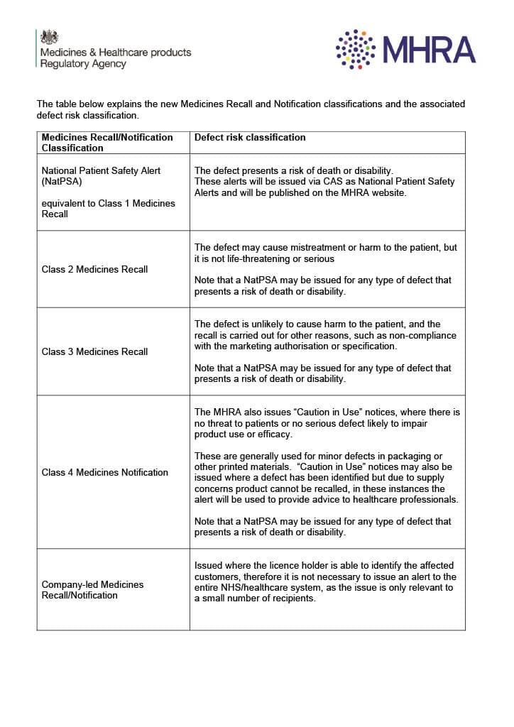 A table explaining the new Medicines Recall and Notification classifications and the associated defect risk classification can be found on the GOV.UK website.